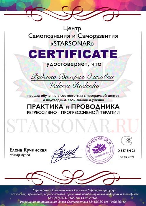 И я обратила внимание на метод регрессии, где проводник направляет клиента правильно заданными вопросами, а клиент благодаря этому сам видит первопричины проблемы и прорабатывает их в сеансе. И тогда я, наконец, оказалась на обучении в центре Старсонар, это было волшебное, незабываемое время нового открытия и познания себя, мира вокруг, и, в целом, мироустройства. Границы понимания Вселенной еще больше расширились, я увидела, что все вокруг живое и со всем можно договариваться. Я проработала свои детские травмы, обиды, страхи, тянущиеся также из прошлых воплощений, активировала свои ресурсы, способности, в том числе целительские. Я открыла себе Себя Настоящую! Жизнь заиграла новыми красками и показала свои светлые стороны.